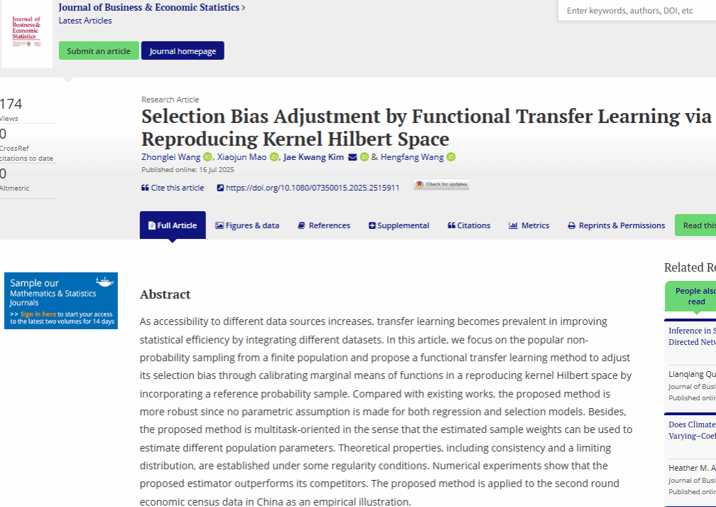 王亚南经济研究院(WISE)、经济学院统计学与数据科学系王中雷副教授,与上海交通大学毛晓军教授、爱荷华州立大学Jae Kwang Kim教授、福建师范大学王恒放讲师合作的题为“Selection Bias Adjustment by Functional Transfer Learning via Reproducing Kernel Hilbert Space”的学术论文被计量经济学与统计学国际权威期刊Journal of Business & Economic Statistics正式接收并在线发表。该期刊是厦门大学经济学科认定的国际A类期刊。