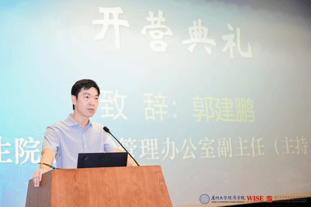 研究生院培养与管理办公室副主任(主持工作)郭建鹏教授首先为夏令营开营典礼致辞,他回顾了厦门大学和厦大经济学科的百年历史,以及新时代厦门大学和厦大经济学科所取得的辉煌成就。他表达了对营员们的美好祝愿,希望同学们能够深度参与这次经济学科夏令营活动,在这里结交到志同道合的朋友,并欢迎同学们在未来加入厦门大学经济学科大家庭。