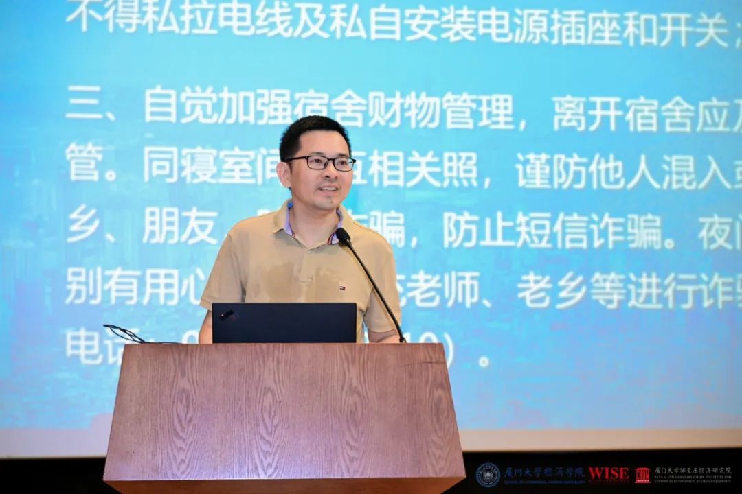 经济学院党委副书记陈泗林随后向各位营员介绍了厦大经济学科夏令营期间的安全须知。他提醒同学们一定重视自身安全,遇到任何紧急情况,要及时与相关负责老师联系。
