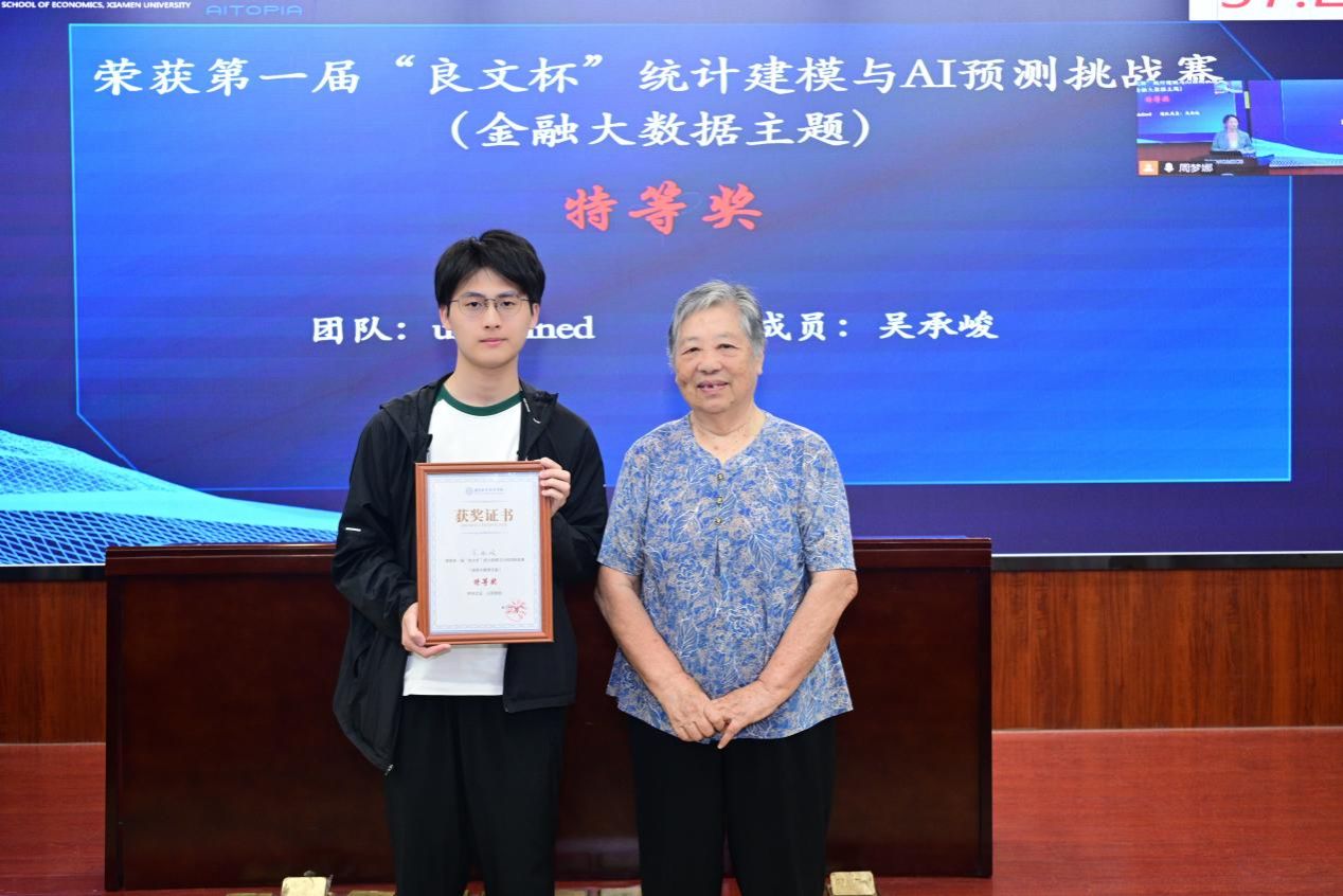 颁奖仪式环节,九十二岁高龄的黄良文教授家属陈金菊教授特别来到现场,为特等奖获得队伍颁发获奖证书。同时,黄良文统计学科教育发展基金会理事代表章飚博士对本次讲坛及比赛进行总结,他表达了对继续办好黄良文讲坛的信心,也赞扬本次比赛中选手们的精彩表现,希望未来“良文杯”竞赛能够越办越好,为同学们搭建与业界连接的桥梁。