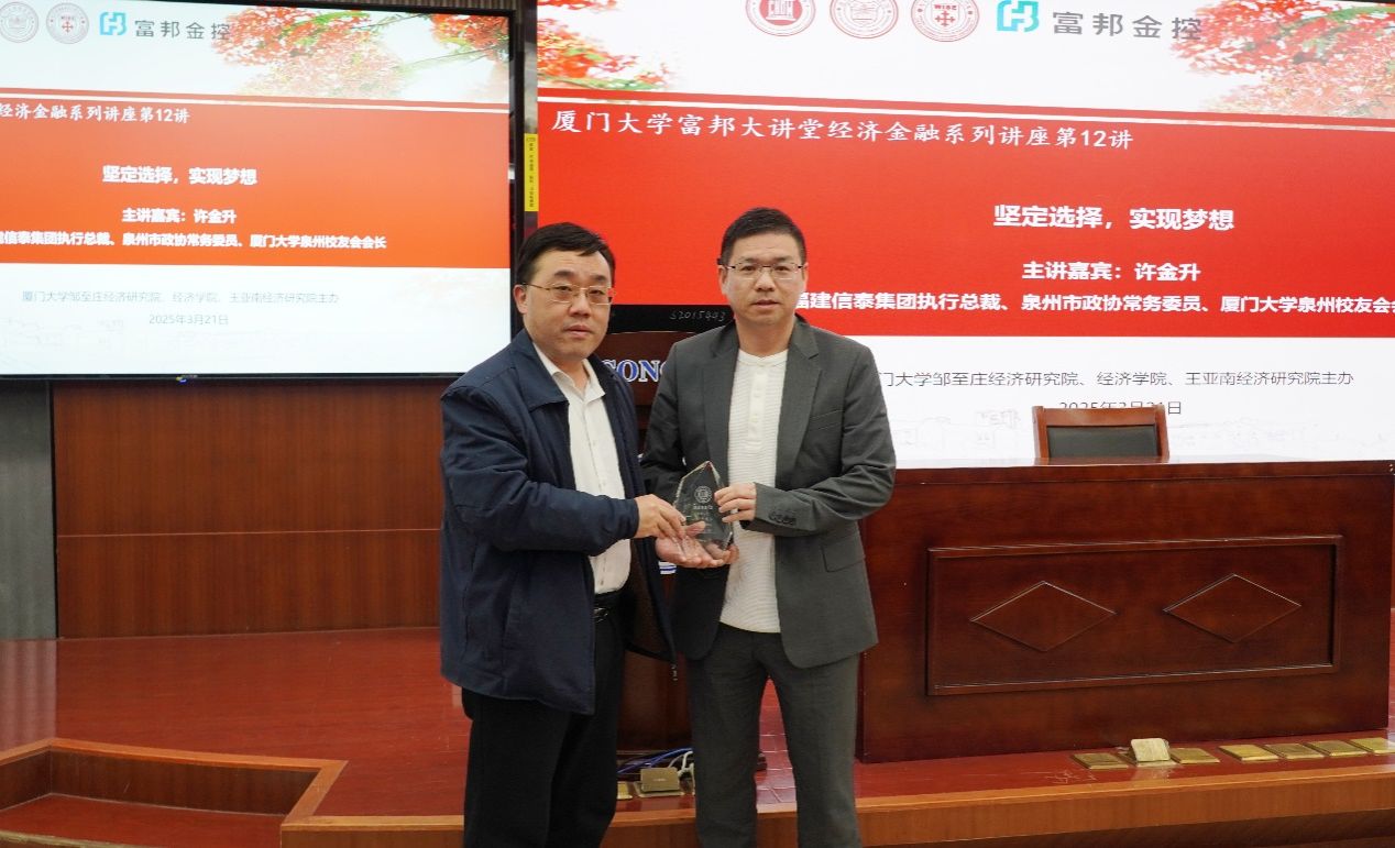 3月21日下午,厦门大学经济学科“富邦大讲堂经济金融系列讲座”第12期邀请到经济学院财政金融系1996级校友——福建信泰集团执行总裁许金升。他以“坚定选择,实现梦想”为题,结合自身奋斗历程串联起一堂生动的商业课,为现场师生揭示传统制造业转型升级的密码。