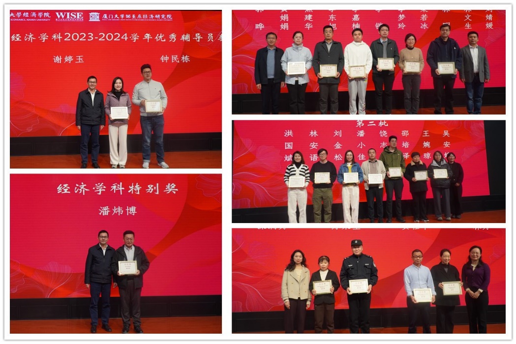 为表彰教职员工在工作中的卓越成绩,感谢他们的辛勤奉献,大会举行经济学科年度优秀教职员工颁奖仪式,分别颁发“2023年度优秀系级领导奖”“2023-2024学年教师考核优秀奖”“2023、2024年度优秀职员奖”“2023-2024学年优秀辅导员奖”“2023年度优秀物业员工奖”,以及“2024年度经济学科特别奖”。经济学科历来高度重视师资队伍、行政技术队伍、党政工作队伍等的建设,致力于打造师德高尚、业务精湛的高素质教职工团队。教职工们在各自岗位上辛勤耕耘,为学生在校安全保驾护航,为学科发展贡献智慧和力量,为进一步提升科研创新竞争力,全面提升人才培养质量奠定扎实基础。
